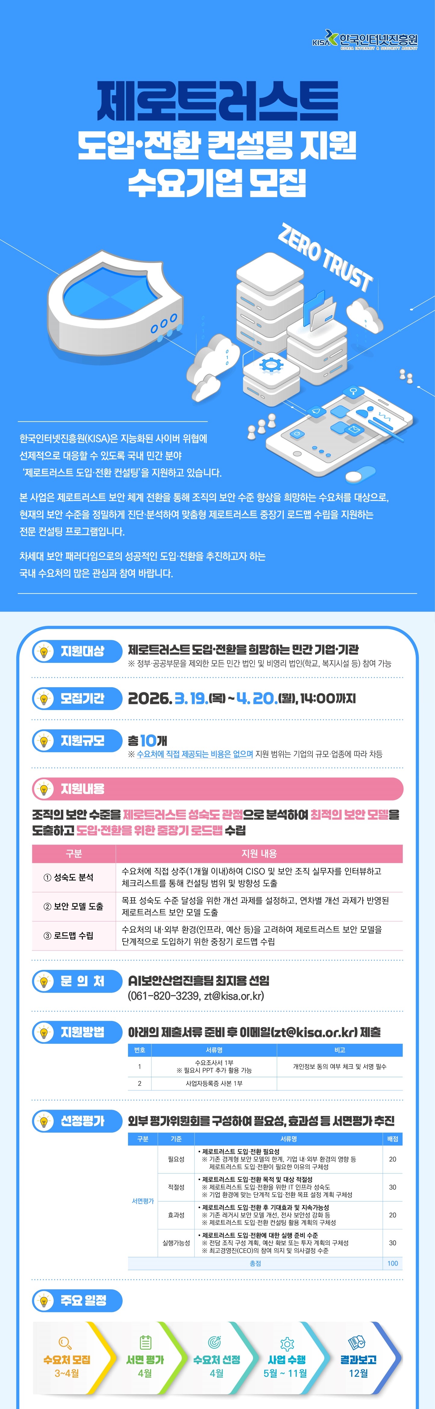 ▶ 지원방법 : [첨부1]을 참조하여 제출서류 준비 후 이메일(zt@kisa.or.kr)로 제출