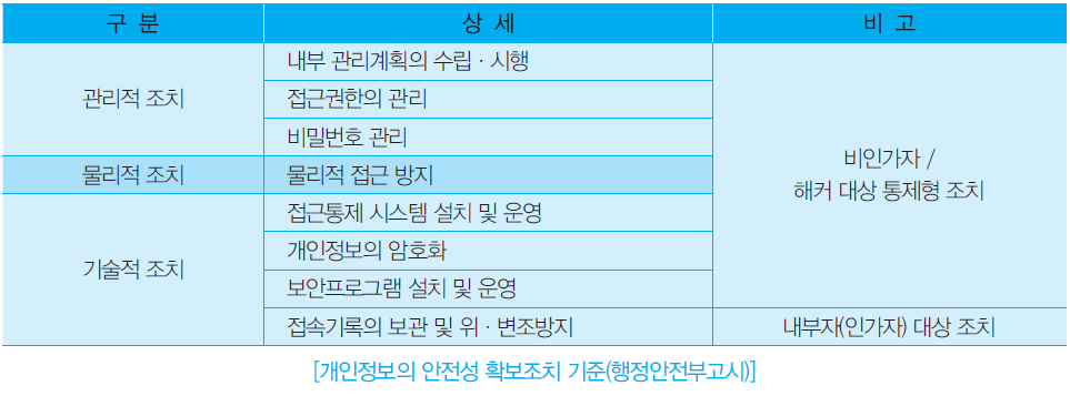 개인정보의 안전성 확보조치 기준은 개인정보보호법 시행령 제30조에 따라 개인정보처리자는 개인정보의 안전성 확보에 필요한 조치를 다음과 같이 취해야 한다고 명시하고 있다.