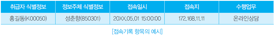 이때 개인정보 접속기록의 가장 중요한 점은 어떠한 업무시스템에서라도 실제 개인정보취급자를 정확히 식별하고, 이 취급자가 언제 어디에서 누구의 정보를 어떻게 수행했는지 빠짐없이 명확하게 기록해야 한다.