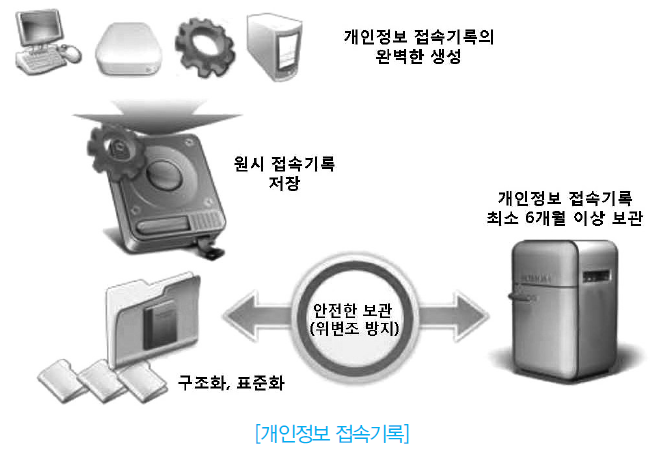 개인정보 접속기록의 보관 개인정보 접속기록을 생성한 후, 6개월 이상 안전한 장소에 보관하여 위변조를 방지해야 한다(개인정 보보호법 시행령 제30조 및 개인정보의 안전성 확보조치 기준 고시 제8조).