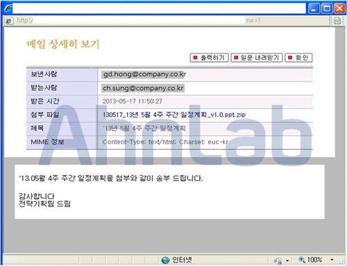| 사내 업무 문서로 위장한 악성코드 주의보! | 2013.05.30 | |