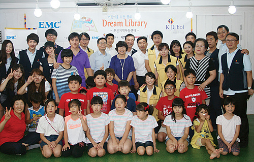개관식에는 한국EMC 임직원 및 KJ희망장학생으로 구성된 자원봉사단이 국내외 도서 1,000여 권을 아동센터 아이들에게 전달함과 더불어 기존 학습 공간을 리모델링하고 도서관 내 꿈길 벽화를 제작하는 등 센터 전체 환경을 개선하는 활동도 함께 진행됐다.