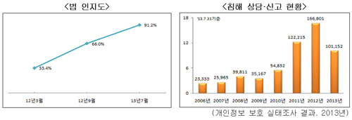 2013년 개인정보 보호 실태조사에 따르면 개인정보보호법 시행 이후 개인정보 보호 중요성에 대한 인식이 확산되는 등 기본적인 보호 기반은 마련된 것으로 보인다. 민간 사업자의 법 인지도는 법 시행 초기인 2012년 3월 33.4%에서 2013년 7월 91.2%로 상승하는 등 사회 전반의 개인정보보호에 대한 인식 수준이 눈에 띄게 향상되었다. 또한 법 인지도 제고로 인해 개인정보 침해 상담 및 신고 건수도 지속적으로 증가하는 추세이다. 그러나 개인정보를 보유하고 있는 각 사업장 또는 기관에서는 아직도 기본적인 조치사항을 다하지 못하는 등 개인정보 침해·유출사고의 가능성이 높은 상황이다. 안전행정부는 2011년 9월 개인정보보호법 시행 이후 2014년 4월까지 총 1,024개소를 점검하였고 905개소(위반율 88.4%)에 대해 과태료 174건, 시정조치 520건 등 총 1,483건의 행정처분을 실시했다.