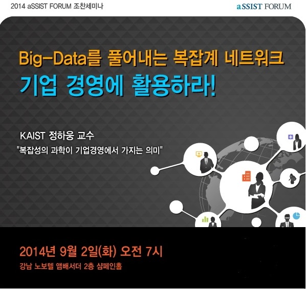 이러한 변화의 흐름에 발맞춰 서울과학종합대학원(aSSIST, 총장 김일섭)은 오는 9월 2일, 「aSSIST FORUM 조찬 세미나」의 주제를 ‘복잡성의 과학이 기업경영에서 가지는 의미’로 정했다고 전했다. 강의를 맡은 카이스트 정하웅 교수는 21세기를 맞아 새롭게 떠오르는 화두인 복잡계(Complex Systems)를 빅데이터와 네트워크 과학에 관한 소개, 그 응용사례를 통해 설명할 예정이다. 복잡계란, 다양하고 수많은 구성요소들이 서로간의 상호작용에 의해 구성요소 하나하나의 특성과는 다른 새로운 현상을 나타내지만, 나름대로의 질서를 보여주는 시스템을 말한다. 우리가 살고 있는 세상은 많은 구성성분으로 이루어진 다체계이고, 그 구성성분 간의 다양하고 유기적인 협동현상에서 비롯되는 복잡한 현상들의 집합체라는 것. 이번 강연에 대해 정하웅 교수는 “www(world-wide-web)와 구글의 성공전략, 후천성면역결핍증(AIDS)과 입소문 마케팅의 관계, 검색엔진을 이용한 선거예측 등 전혀 상관없어 보이는 여러 복잡계 물리연구 사례들을 수식 한 줄 없이 소개할 것”이라며 “우리가 살고 있는 사회는 복잡해 보이지만 사람들이 서로 얽혀있는 네트워크로 해석될 수 있는 좁은 세상 네트워크로 이해할 수 있다”고 말했다. aSSIST FORUM은 매월 첫째 주 화요일 오전 7시에 열리는 ‘지식융합세미나’로 서울과학종합대학원에서 기획하고 있다. 주제는 불확실한 경제상황 대비를 위한 경제전망, 경영환경 변화를 앞서가기 위한 국내외 비즈니스 트렌드, 경영전략과 통찰력 등을 다룬다. 오피니언 리더로 활동중인 1,000여 명의 CEO동문에게는 통합 평생학습의 장으로, 사회 각계각층의 대표적인 리더와 리더를 준비하는 임직원, 각 분야의 전문가 등에게는 자기 계발을 통한 열린 학습의 장으로 자리잡고 있다. 빅데이터를 풀어내는 복잡계 네트워크, 기업 경영에 활용하라! (aSSIST FOURM 조찬 세미나) △ 강 연 : 복잡성의 과학이 기업경영에서 가지는 의미 / 정하웅 KAIST 석좌교수 △ 일 시 : 2014년 9월 2일(화) 오전 7시 ~ 9시 △ 장 소 : 노보텔 앰배서더 강남 2층 샴페인홀 △ 신 청 : 서울과학종합대학원 홈페이지(www.assist.ac.kr) 전화 02-360-0718 △ 문 의 : arkim@assist.ac.kr [정규문 기자(kmj@boannews.com)] <저작권자: 보안뉴스(http://www.boannews.com/) 무단전재-재배포금지> |