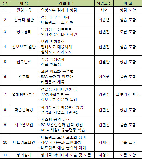 정보보호 영재교육원은 서울여자대학교, 공주대학교, 대구대학교, 목포대학교에서 각각 교육이 이뤄지고 있으며, 현재 목포대학교만이 수강생을 추가 모집 중이다. 목포대는 제4권역(전남, 광주, 전북, 제주 지역)의 중·고등학생 중에서 정보보호에 끼와 재능이 있는 학생을 대상으로 하고 있다. 학교 성적보다도 정보보호에 끼와 재능이 있는 학생의 잠재력을 중심으로 교육생을 선발한다. 원서접수는 직접 방문해 접수하거나 우체국 등기로 접수할 수 있다. 접수기간은 오는 20일부터 26일까지다. 교육은 4월 4일부터 11월 21일까지 총 8개월 동안 진행된다. 봄학기 및 가을학기 중에도 격주 토요일 수업이 진행되고, 여름방학 집중교육은 8월 둘째 주 목포대학교 생활관에서 단체 합숙하며 4박 5일 동안 수업한다. 정보보호 전문기관 탐방은 8월 집중교육시 실시될 예정이다.