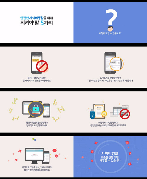 [보안뉴스 민세아] 친구와 메신저로 연락하고, SNS로 세상과 소통하고, 이메일로 업무를 하며, 카페에서 공부하는 요즘. 인터넷과 IT기기의 발전으로 우리의 생활은 더욱 편리해졌다. 그러나 이와 함께 각종 사이버범죄들은 늘 우리를 위협하고 있다. 편리함과 함께 사이버범죄의 위협도 커져가고 있다. 전년대비 376% 증가한 악성코드는 한해 125만 1천 586여건, 발생한 사이버범죄만도 한해 15만 5천 366여건, 사이버범죄는 4분마다 1건씩 발생하고 있으며 지금도 악성코드가 끊임없이 만들어지고 있다. 이에 경찰청 사이버안전국에서는 4월 2일을 ‘사이버범죄 예방의 날’로 지정하고 인식 확대와 사이버범죄 예방의 중요성을 널리 알리고자 경찰청 및 유관기관과 함께 캠페인을 진행했다. 2일 오후 2시부터 명동 거리에서 진행된 ‘사이버범죄 예방의 날’ 행사에는 △강신명 경찰청장을 비롯해 △백기승 인터넷진흥원장 △이광구 우리은행장 △허의도 방송통신심의위원회 사무총장 △민성기 전국은행연합회 전무이사 등 유관기관 (부)기관장들 △사이버 명예경찰인 누리캅스 회원들이 참석해 사이버 범죄예방 및 기관간 협업의 중요성에 대한 공감대를 형성했다. 이날 행사장에서는 서울지방경찰청 홍보단의 마술 공연과 함께 △사기 이용 계좌 및 전화번호 조회 △악성코드 탐지·차단 △스파이앱 탐지·삭제가 가능한 ‘사이버캅’ 앱을 스마트폰에 바로 설치해 주는 이벤트를 진행해 시민들의 호응을 얻었다. 이와 더불어 경찰청 사이버안전국은 사이버안전에 대한 국민적 관심을 높이기 위해 전국에서 사이버범죄 예방 교육을 일제히 실시하고, 전광판·SNS 등 다양한 채널을 활용해 사이버범죄 예방 수칙을 적극 홍보한다. 또한, 사이버안전국은 사이버범죄 예방을 위한 수칙과 홍보영상을 제작해 국민들이 사이버범죄에 보다 효과적으로 대응할 수 있도록 정보를 제공하고 있다. 경찰청 사이버안전국 홈페이지에는 △직거래·쇼핑몰 사기 △스미싱 △파밍 △계정도용 △악성프로그램 △메모리해킹 △스팸메일·메시지 △스파이앱 △몸캠 등에 대한 범죄예방수칙과 주의사항을 상세히 안내하고 있다. 뿐만 아니라 △인터넷 사기 예방 5계명 △사이버 범죄 기본 피해예방수칙 △사이버 범죄 알고 대처하자 △기본이 바로선 대한민국 △사이버학교폭력 예방영상 △신종 금융범죄예방 프로젝트 등의 재미있는 홍보영상을 배포하고 있다.