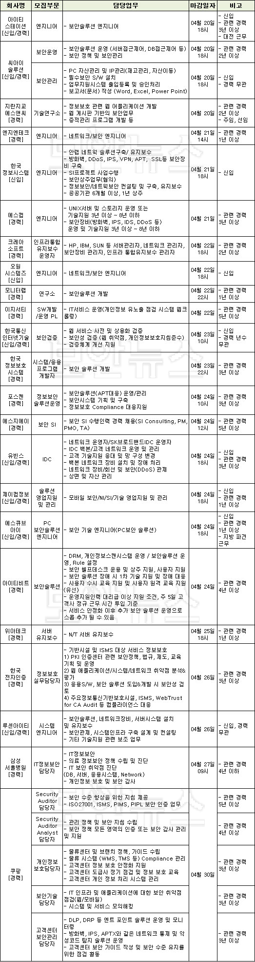 | 4월 넷째주 보안인력 채용...쿠팡 등 ‘팡팡’ | 2015.04.18 | |