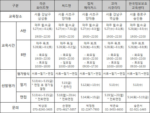 교육시간은 공통적으로 매주 월·수·금 진행되는 A반과 매주 목·토, 목·일, 화·토 진행되는 B반으로 나눠진다. 5월 11일까지 기업 및 공공기관에 재직중인 정보보호 담당자가 원하는 교육기관에 접수를 하면 각 접수기관에서는 기관별 평가방식에 맞게 필기시험과 면접을 진행한 후 최종 교육생을 선발한다. 선발된 교육생을 대상으로 5월 말부터 8월 초까지 100시간의 1차 교육이 시작된다. A반의 경우 대략 30일 정도의 기간동안 교육이 진행되고 B반의 경우 20일 정도의 기간이 소요된다.