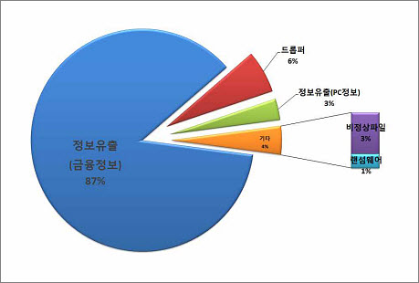 취약한 소프트웨어 악용 유형에는 어도비 플래시 플레이어 취약점이 39%의 비율로 가장 높았다. 이와 함께 자바 애플릿(Java Applet) 취약점, MS OLE 취약점 등의 순이었다. 악성코드 유형에는 공인인증서, 비밀번호 등 금융정보를 탈취하는 금융정보 유출 악성코드가 87%의 비율을 차지했으며, 원격제어, 정상 애플리케이션인 것처럼 배포된 뒤 실행되면 악성코드를 설치하는 방식인 드롭퍼, 금융사이트 파밍 등의 악성코드 유형이 다양하게 나타났다.