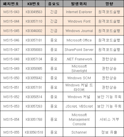 | 원격코드 실행 취약점 등 MS 보안업데이트 13종 발표 | 2015.05.14 | ||