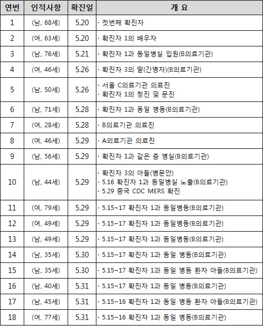 | 메르스 감염·의심자·격리자 현황(6월 1일) | 2015.06.01 | ||
