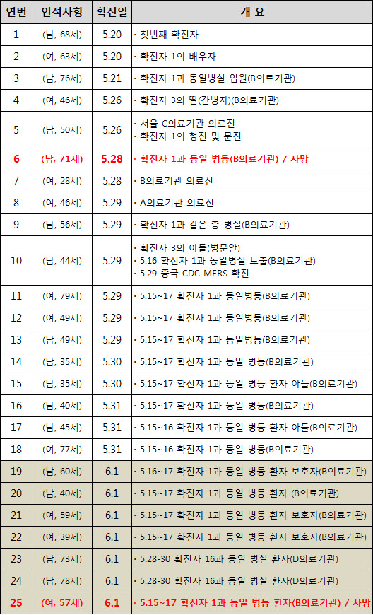 | 중동호흡기증후군 ‘메르스’ 감염자 현황(6월 2일) | 2015.06.02 | ||