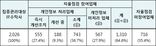또한, 이번 자율점검에 참여하지 않은 716개 IT수탁사에 대해서도 연차적으로 전수조사를 실시하고 위법사항을 적발·처분할 예정이다.