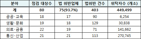 점검결과 80개 업체 중 75개 업체(93.7%)가 개발·운영하는 개인정보처리 시스템에 403건의 법 위반사항이 적발됐고, 이들 업체에 시스템 공급·유지보수 등 개인정보를 위탁처리하는 사업자는 45만여 개에 달하는 것으로 조사됐다.