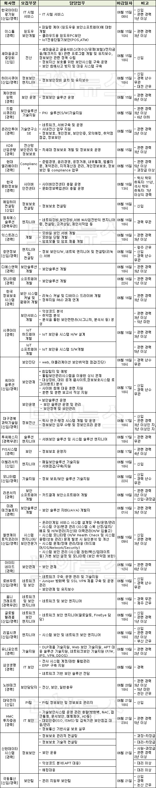새마을금고, KDB산업은행, 삼성생명 등 39개사, 48개 분야 모집 [보안뉴스 민세아] 전국을 강타하고 있는 메르스 공포에도 불구하고, 양질의 보안인력을 채용하고자 하는 기업들의 열기는 식지 않고 있다. 2015년 상반기가 얼마 남지 않은 6월 셋째주에는 39개사가 48개 분야에서 보안인력을 모집한다. 이 중 경력만을 채용하는 곳은 21개사, 신입이나 경력을 모집하는 곳은 11개사, 신입을 채용하는 곳은 4개사, 경력에 관계없이 모집하는 곳은 3개사다.