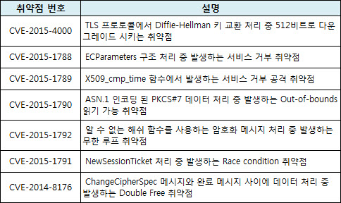 서비스 거부 공격 등 7개 취약점...각각 버전 업데이트로 해결 가능 [보안뉴스 민세아] 취약한 OpenSSL 버전을 사용할 경우 공격자가 서버와 클라이언트 사이에서 암호화된 데이터를 복호화할 수 있는 취약점과 서비스 거부 취약점 등 7개의 취약점을 패치한 보안 업데이트가 발표됐다.