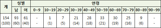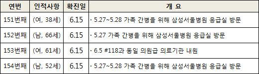 ▲6월 15일 신규 확진자 현황 기존 확진자 중 9번째(남, 56세), 56번째(남, 45세), 88번째(남, 47세) 확진자 등 3명이 6월 15일 퇴원해 전체 퇴원자는 17명으로 늘어났다. 기존 확진자 중 38번째(남, 49세, 알코올성 간경화·당뇨), 98번째(남, 58세), 123번째(남, 65세) 확진자 등 3명이 6월 15일, 16일 새벽 사망해 전체 사망자는 19명으로 집계됐다. 사망자 19명 중 만성호흡기질환, 암, 심뇌혈관질환 등 기저질환자는 15명으로 나타났다. 지금까지의 확진자 총 154명을 감염유형별로 분류해 보면, 병원을 내원한 환자가 71명으로 가장 많았고, 환자 가족이나 가족 이외의 문병 등 방문객이 57명, 의료진 등 병원 관련 종사자가 26명으로 각각 뒤를 이었다.