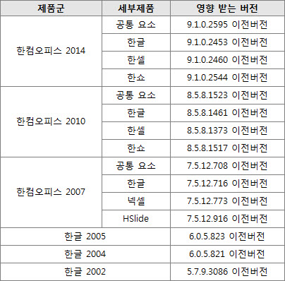 ▲ 영향 받는 소프트웨어(자료출처 : KISA) 해당 취약점은 한글과컴퓨터 홈페이지에서 보안업데이트 파일을 직접 다운로드(http://www.hancom.com/downLoad.downPU.do?mcd=005) 받아 설치하고, 영향 받지 않는 버전(보안#29)으로 업데이트해 해결할 수 있다.