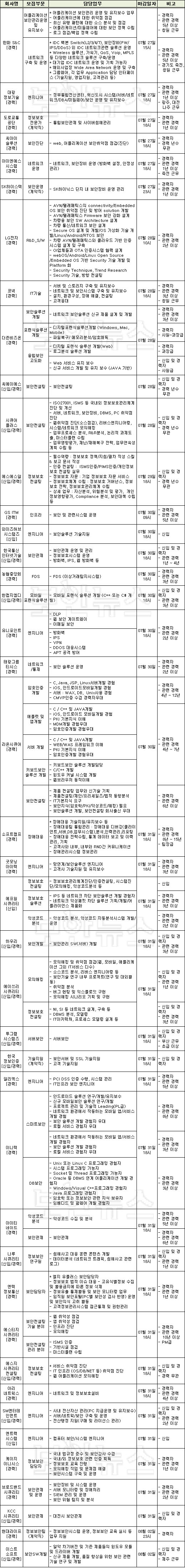 LG전자, SM엔터테인먼트, 농협중앙회 등 42개사 58개 부문서 채용 [보안뉴스 민세아] 보안인력을 모집하는 기업에서는 여전히 경력자를 선호하는 곳이 많지만 정보보안 전문기업이나 엔지니어 부문에서 최근 신입도 모집하는 추세다. 이와 함께 인포섹에서도 27일 마감되는 대규모 채용을 진행하고 있고, 에이쓰리와 안랩에서도 수시채용 중이다.