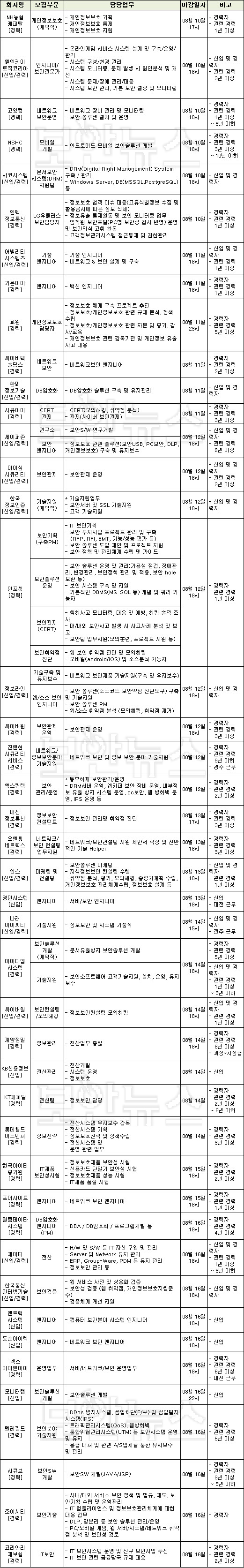 이번 8월 둘째 주에는 43개사가 50개 부문에서 보안인력을 기다리고 있다. 경력자를 채용하는 곳은 25개사, 신입과 경력을 함께 모집하거나 경력에 관계없이 모집하는 곳은 13개사, 신입을 채용하는 곳은 5개사다.
