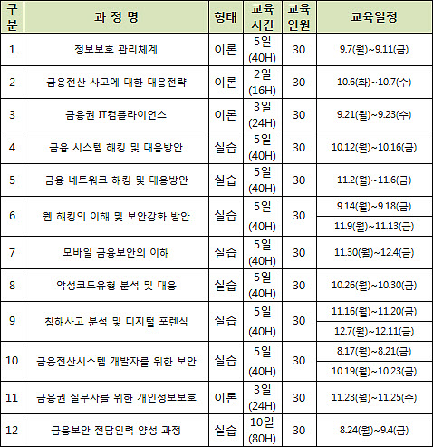 금융회사 임직원 선착순 30명 대상, 10일간 장기 교육과정 개설 [보안뉴스 민세아] 금융회사 IT 및 정보보호 인력이 필요로 하는 필수 이론을 실습과 함께 집중적으로 교육하는 교육과정이 올 하반기에 진행될 예정이다. 금융보안원(원장 김영린)은 금융보안 전담인력 양성을 위한 10일간의 장기 교육과정을 개설하고 오는 8월 24일부터 9월 4일까지 교육을 진행할 계획이다. 금융회사의 자율적 IT 보안체계 기반 조성을 위한 핵심인력 양성을 목표로 하는 이번 교육과정은 △최신 금융 IT 융합기술 및 정책 △판례 중심의 보안사고 사례 △금융권 표적 공격 대응 방법 등을 주요 내용으로 한다. 또한, 금융보안원은 정보보호 관리체계, 금융권 IT컴플라이언스 등 정책 과정과 금융시스템 해킹 및 대응, 금융권 디지털 포렌식 등 기술 과정 등 금융회사 임직원이 수준별, 직무별로 보안에 대한 지식을 습득하고 실무를 경험할 수 있도록 다양한 집합교육 과정을 운영한다. 이번 하반기에는 금융 CISO 특화과정, 금융IT 내부감사 양성 과정 등 테마교육을 추가로 개설·운영할 계획이다.