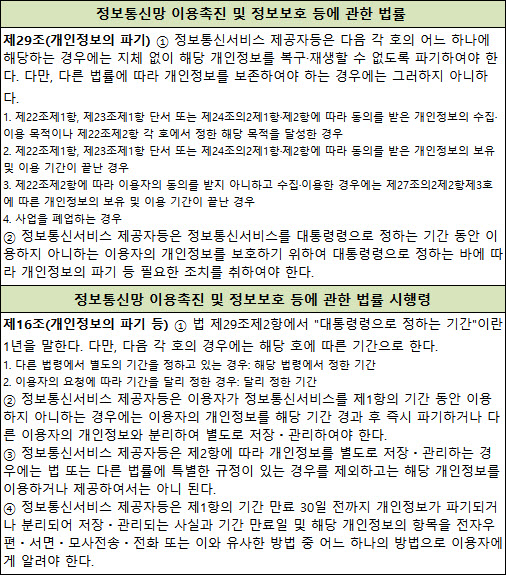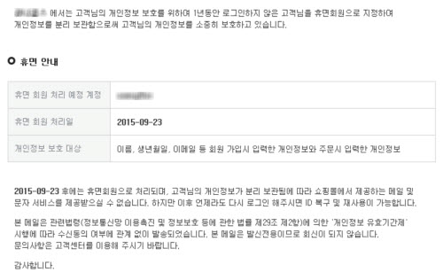 지난해 정통망법(정보통신망 이용촉진 및 정보보호 등에 관한 법률)과 그 시행령이 개정되면서 1년 동안 로그인 등 사용기록이 없는 개인정보는 2015년 8월 18일부터 파기하거나 별도로 분리 저장해야 하기 때문이다. 기존에는 이용자의 개인정보를 3년 동안 보관하도록 했으나 정통망법과 시행령이 개정되면서 개인정보 보관기간이 1년으로 축소됐다. 이에 따라 기업에서는 회원들을 대상으로 삭제 기점인 8월 18일 전후로 ‘휴면계정 전환’ 및 ‘개인정보 파기’ 알림 메일을 보내고 있는 것이다. 해당 사이트에 따라 개인정보, 마일리지, 게임 기록 등이 모두 파기될 수 있기 때문에 사용자들은 미리 휴면계정 전환이나 개인정보 파기에 대비하는 것이 좋다. 기업에서도 이를 막기 위해 파기 약 한달 전부터 알림 메일을 지속적으로 보내고 있다. 그런데 개인정보를 파기하지 않고 별도로 보관하는 이유는 뭘까? 이는 나중에 사용자가 다시 서비스를 이용하려 할 경우 저장된 정보를 가져오는 것이 신규 가입하는 것보다 쉽게 서비스를 이용할 수 있기 때문이다. 실제로 ‘휴면계정 전환’ 알림 메일에서는 휴면계정으로 전환된 이후라도 다시 로그인하면 아이디를 복구해 재사용할 수 있다고 전하고 있다. 하지만 개인정보가 파기되면 이전에 보유하고 있던 마일리지나 중요 기록들이 삭제되어 복구가 불가능하다. 이용자의 개인정보가 별도로 ‘분리 저장’되는 것은 ‘파기’와는 다르다. 만약 개인정보를 분리 저장한 서버가 해킹당할 경우 개인정보가 유출될 위험을 피할 수 없기 때문이다. 개인정보가 분리 저장되는 것이 불안하다면 이용하지 않는 웹사이트의 경우 홈페이지에 접속해서 직접 탈퇴하는 방법도 있다.