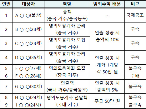 또한, 이들은 국내에서 활동 중인 명의도용 계좌 전달책 및 중국 전자금융사기 범죄조직과는 서로 신분을 감추는 등 철저한 점조직 형태로 운영됐다. 피의자들이 공급한 명의도용 계좌들을 통한 피해금액 인출에 이어 중국으로의 송금이 완료돼야만 각 범행단계별 피의자들에게 범죄수익금이 배분되는 구조다.