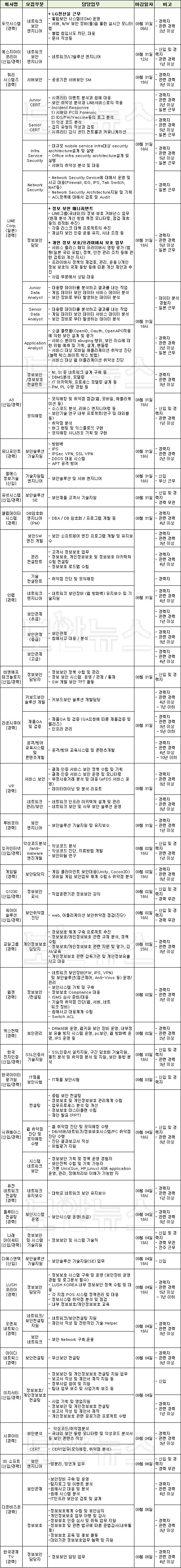 LINE Corp, 안랩, 게임빌, LUSH코리아 등 36개사 58개 부문 채용 [보안뉴스 민세아] 무더위가 기승을 부렸던 여름도 아침 저녁으로 선선한 바람이 불어오면서 막바지를 지나고 있다. 이제 바야흐로 수확의 계절인 가을의 시작, 9월을 코앞에 두고 있다. 9월 들어서는 보안전문 인력채용도 보다 활발해질 것으로 보인다. 특히, 이번에는 네이버의 계열사인 라인(LINECorporation, 일본법인)에서 보안관련 인력을 대거 채용하고 있고, 안랩도 수시채용을 진행하고 있다. 핸드메이드 화장품 브랜드인 LUSH코리아에서도 보안담당자를 모집하고 있어 눈길을 끈다.