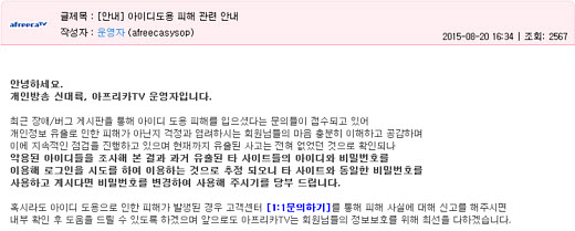 이처럼 지난해에 이어 최근에도 아프리카TV 이용자들의 계정을 탈취해 사설 토토, 불법 도박 방송 등에 악용하는 사례가 늘어나면서 이용자들이 자기도 모르는 사이 자신의 계정이 정지되는 피해가 속출하고 있다. 아프리카TV 측은 계정을 영구정지당하면 별다른 방법 없이 탈퇴 후 재가입하는 방법밖에 없다는 반응이다. 물론 탈퇴하게 되면 기존 계정으로 보유하고 있던 방명록 등의 정보나 아이템은 완전히 사라지게 된다. 강모 군은 해당 계정에 유료 아이템을 보유하고 있었지만 아프리카TV로부터 환불을 받을 수 없었다. 그는 “만약 소액 아이템이 아니라 고가의 유료아이템을 가지고 있는 이용자일 경우 피해가 더 크다”며, 아프리카TV 측의 안일한 대응을 아쉬워했다. 이에 강모 군이 아프리카TV 측에 문의하자 아프리카TV 측은 “당사는 회원들의 개인정보를 완벽하게 관리하고 있다. 계정 도용은 개인정보 유출로 인한 것이 아니며, 다른 사이트와 아이디, 비밀번호가 동일할 경우 이런 일이 발생할 수 있다. 만약 범인을 찾고 싶다면 사이버 수사대에 연락하라”는 답변을 받았다고 밝혔다.