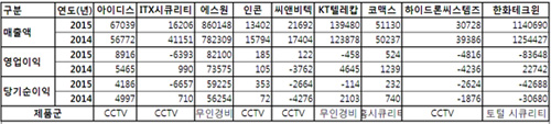 KT텔레캅의 2015년도 상반기 영업이익은 -4억 5,800만원으로 2014년도 같은 기간의 46억 4,500만원보다 109.9% 급락했다. 이 기간 당기순이익은 -1억 1,400만원으로 전년 동기의 21억 300만원보다 105.4% 감소했다. 코맥스, 매출 늘었지만 … 영업익·당기순익은 저조 코맥스의 2015년도 상반기 매출(1.8%↑)을 제외한 영업이익(57.7%↓)과 당기순이익(68.6%↓)은 지난해 같은 기간보다 감소했다. 코맥스의 2015년도 상반기 매출은 511억 3,000만원으로 전년 동기의 502억 3,700만원보다 8억 9,300만원 증가하며 매출폭이 1.8% 상승하는데 그쳤다. 이 기간 영업이익은 5억 2,400만원으로 2014년 상반기의 12억 3,900만원보다 57.7% 하락했다. 같은 기간 당기순이익은 2억 3,200만원을 달성해 전년 동기의 7억 4,000만원보다 68.6% 축소됐다. 하이트론씨스템즈, 영업익·당기순익 모두 마이너스 하이트론씨스템즈의 올해 상반기 실적은 전년 동기 대비 저조했다. 매출은 22% 감소했고, 영업이익(13.7%↓)과 당기순이익(39.9%↓)은 지난해에 이어 모두 적자를 기록했다. 하이트론씨스템즈의 2015년도 상반기 매출은 307억 2,800만원으로 지난해 동기의 393억 8,600만원보다 86억 5,800만원을 덜 벌어들이며 22% 감소했다. 같은 기간 영업이익은 -48억 1,600만원을 기록해 전년 동기의 -42억 3,600만원보다 13.7% 줄었다. 이 기간 당기순이익은 -26억 2,400만원으로 전년 동기의 -18억 7,600만원보다 39.9% 축소됐다. 한화테크윈, 일시적 적자...장기 전망은 맑음 한화테크윈이 사명을 바꿔단 뒤 달성한 첫 실적은 마이너스다. 시장에서는 이를 한화가 삼성테크윈을 인수하면서 생긴 일시적인 적자일 것으로 보고 장기적으로는 실적 개선이 이뤄질 것으로 예측하고 있다. 한화테크윈의 올해 상반기 매출은 1조 1,406억 9,000만원으로 지난해 같은 기간 달성한 1조 2,544억 2,700만원보다 9.1% 감소됐다.
